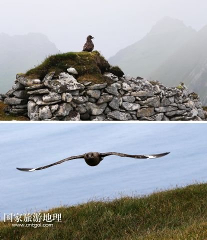 上圖,一只大賊鷗把當(dāng)年村民的儲(chǔ)物石屋當(dāng)作了自己的巢穴(7月19日攝)。圣基爾達(dá)島上散布著數(shù)百個(gè)石頭壘砌,草皮作頂?shù)膬?chǔ)物石屋,用來(lái)保存村民獵取的鳥(niǎo)類(lèi)和用途燃料的泥炭。下圖,一只大賊鷗直飛過(guò)來(lái),襲擊靠近它的巢穴的記者(7月19日攝)。