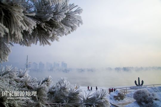 當(dāng)日是冬至,吉林市氣溫降至零下二十?dāng)z氏度,松花江岸邊形成的霧凇景觀吸引了眾多游客。