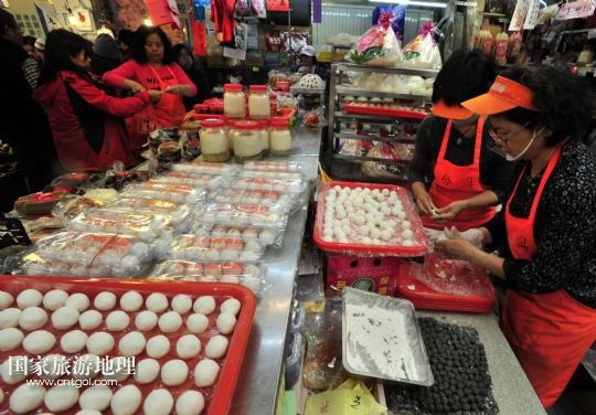 12月22日,臺(tái)北市南門市場的攤主手工包湯圓,供顧客選購。