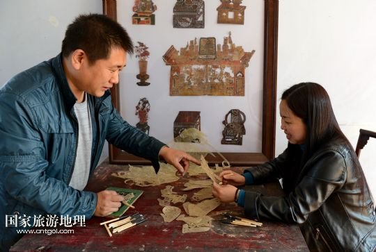 國家旅游地理 河北唐山4月2日訊 郭寶在檢查一件皮影藝術(shù)品的雕刻質(zhì)量(3月30日攝)。河北省遷安市趙店子鎮(zhèn)馬古寺村村民郭寶自幼喜歡皮影雕刻,師承當(dāng)?shù)氐窨趟嚾送跽淅舷壬?,他雕刻的影人造型古樸、工藝精?xì),深受皮影收藏愛好者的歡迎。2003年,郭寶成立了“郭寶皮影傳承工作室”,并從村里招來20多位喜歡皮影藝術(shù)的農(nóng)民專門從事皮影雕刻。經(jīng)過幾年的發(fā)展,如今郭寶皮影工作室開發(fā)設(shè)計皮影工藝品3000余種,在傳承保護(hù)唐山皮影的同時還獲得了豐厚的收入。 /新華社記者楊世堯攝