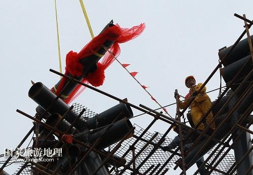 國家旅游地理 上海8月3日訊 8月3日,上海機械施工集團公司的工程人員指揮最后一榀桁架的吊裝。當日上午,隨著塔冠結構中最后一榀鰭狀桁架緩緩起吊并安裝到位,歷時近6年建設的“上海中心”按計劃順利達到設計高度632米,刷新了“申城之巔”的新紀錄。據(jù)介紹,“上海中心”2014年年底將實現(xiàn)除酒店精裝修部分外的土建竣工,2015年年中將投入運營。新華社記者 裴鑫 攝