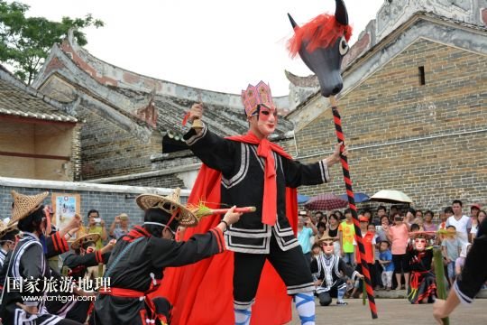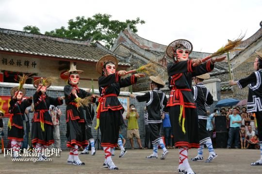 國家旅游地理 廣東云浮6月14日訊 6月13日,在廣東省郁南縣蘭寨古村,郁南縣民間藝人在表演國家級(jí)非遺郁南禾樓舞。